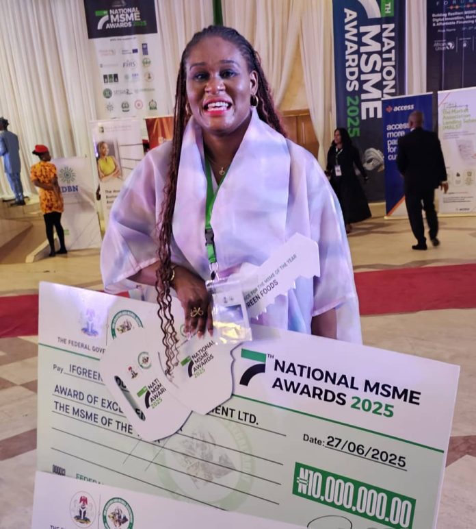 Ifeoma Okonkwo, Chief Executive Officer of IFGREEN — an integrated agribusiness company leveraging technology to process cassava into premium industrial derivatives such as gluten-free flours and food-grade starch for food industries emerged as the overall winner of the grand prize valued at ₦220 million. The award, presented during the 7th edition of the National MSME Awards held at the State House Banquet Hall, Abuja, on Friday, June 28, 2025, included a brand-new car, a retail shop, and ₦10 million in cash.